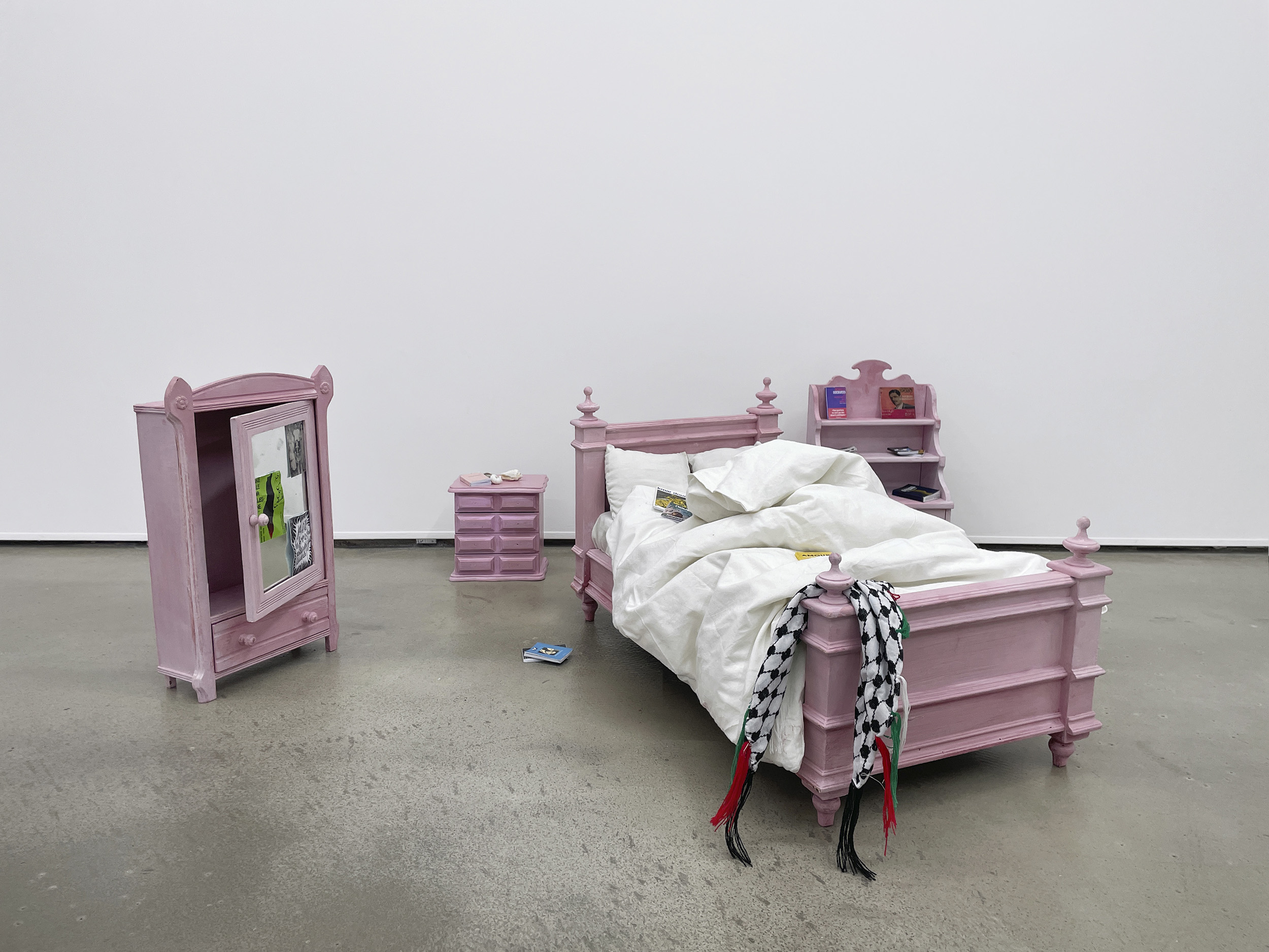 « Dans la chambre il y a entre autres : La prochaine fois le feu, James Baldwin ; Un fanzine de mon amie Kmar Daougi ; Stone Butch Blues, Leslie Feinberg ; Ce que le sida m’a fait, Elisabeth Lebovici ; Sister Outsider, Audre Lorde ; Des paillettes sur le compost, Myriam Bahaffou ; La plus secrète mémoire des hommes, Mohamed Mbougar Sarr ; La race tue deux fois, Rachida Brahim ; La puissance des mères, Fatima Ouassak ; les albums de Dahmane El Harrachi, Isha et Medine. » En reproduisant fidèlement les couvertures des livres, Camille Soualem ne livre pas, ou pas seulement, sa bibliographie, elle nous incite à faire corps dans la lecture. Faire corps commun avec ce corpus. Ne pas rester seule, « ne rien lâcher, ne laisser tomber personne » comme l’écrivait Dorothy Allison. C’est peut-être —sans doute— la meilleure description d’une exposition.