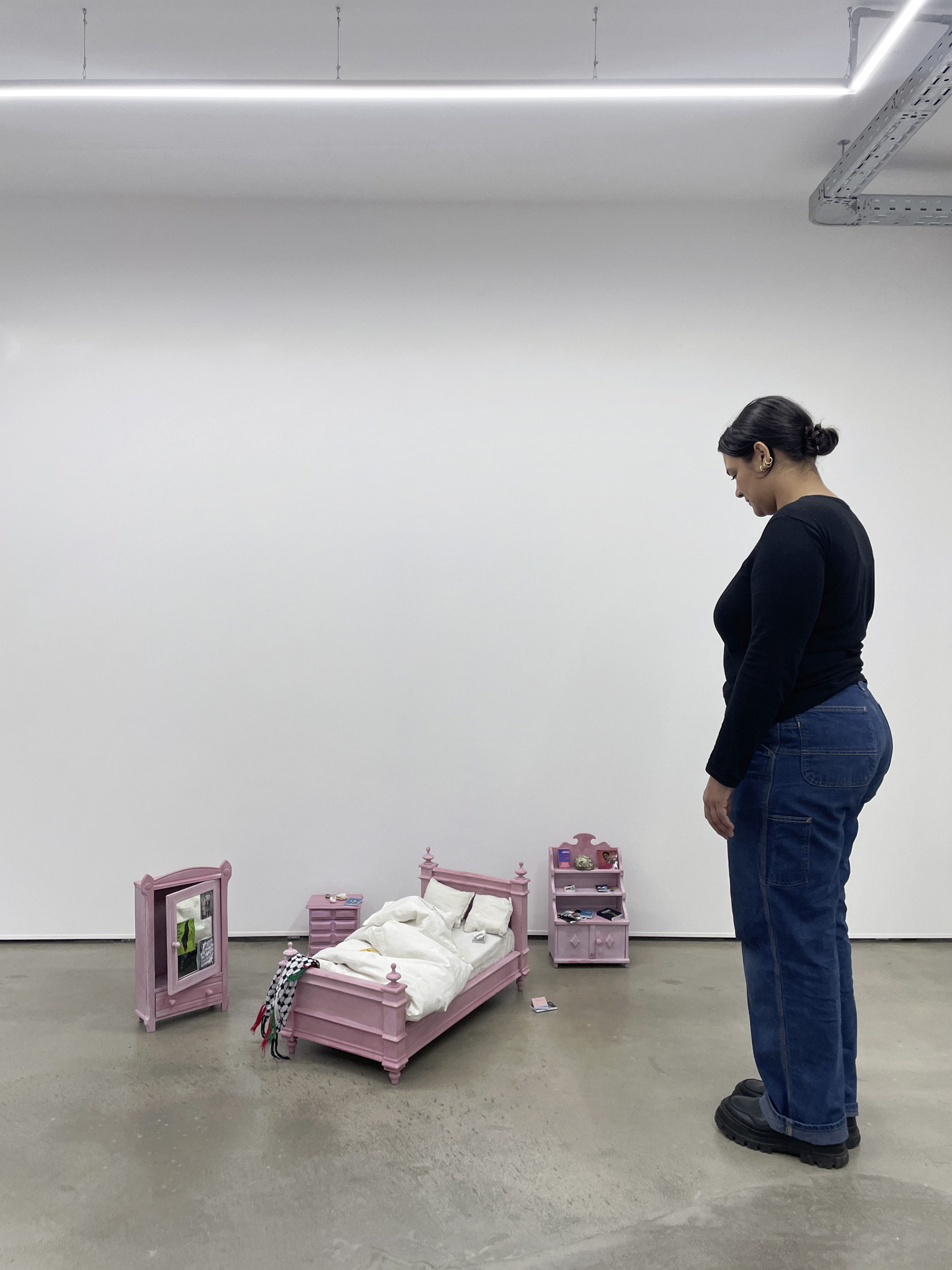 For the first time, Camille Soualem presents it in a miniaturized version: the bedroom. A population of pictures and books scaled down for this interior - and the insideness it suggests - inhabits the place, haunt it, and also give it a function: « it is in the bedroom, says Camille, where a second education is created, one that owes nothing to the State or its institutions”. In the bedroom, the painted body has disappeared to make room for the body - our own - being involved in reading, decoding a title and getting to know a cover. This involvement is also embodied, like a kickback, in the painting Origines, a fragment of a naked body turned around “like Courbet’s Origin of the World reversed”, says Camille. Indeed, she flips the point of view in order to put the one that is being painted and the ones that are looking in the extension of her legs, her pubis, her belly, as if its was their own. A book thrones upon her/our tight, exhorting us to stay barbaric as writen by its author Louisa Yousfi (original french title : Rester Barbare ; original english title : In Defense of Barbarism: Non-whites Against the Empire). This physical contact with writing might be a reading guide, a way to look out for a truth as close as possible to the intimate, refusing the integration to a patriarchal, colonial and heteronormative civilization which has imposed upon us its vision of the origin, if not of the whole world.