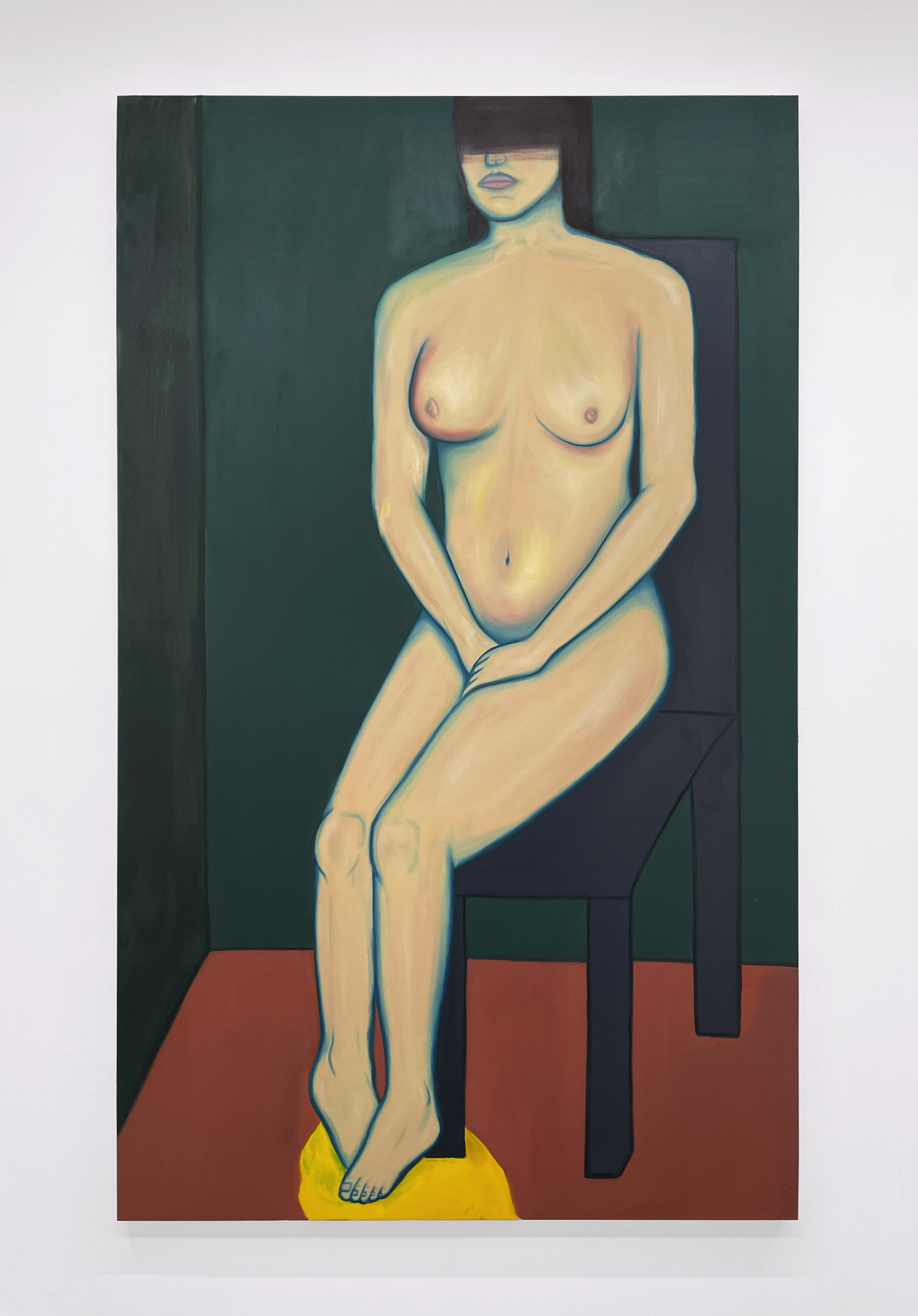In her large-scale painting, Ferizi’s depiction of a nude woman on a chair and urinating on herself, foregrounds the