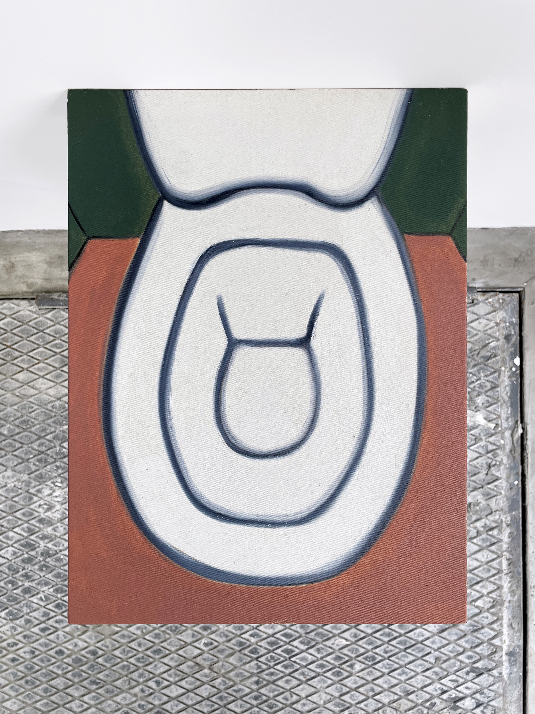 This “closing in” feeling that the 11 protruding toilet seat paintings exude transforms the space of the gallery into a