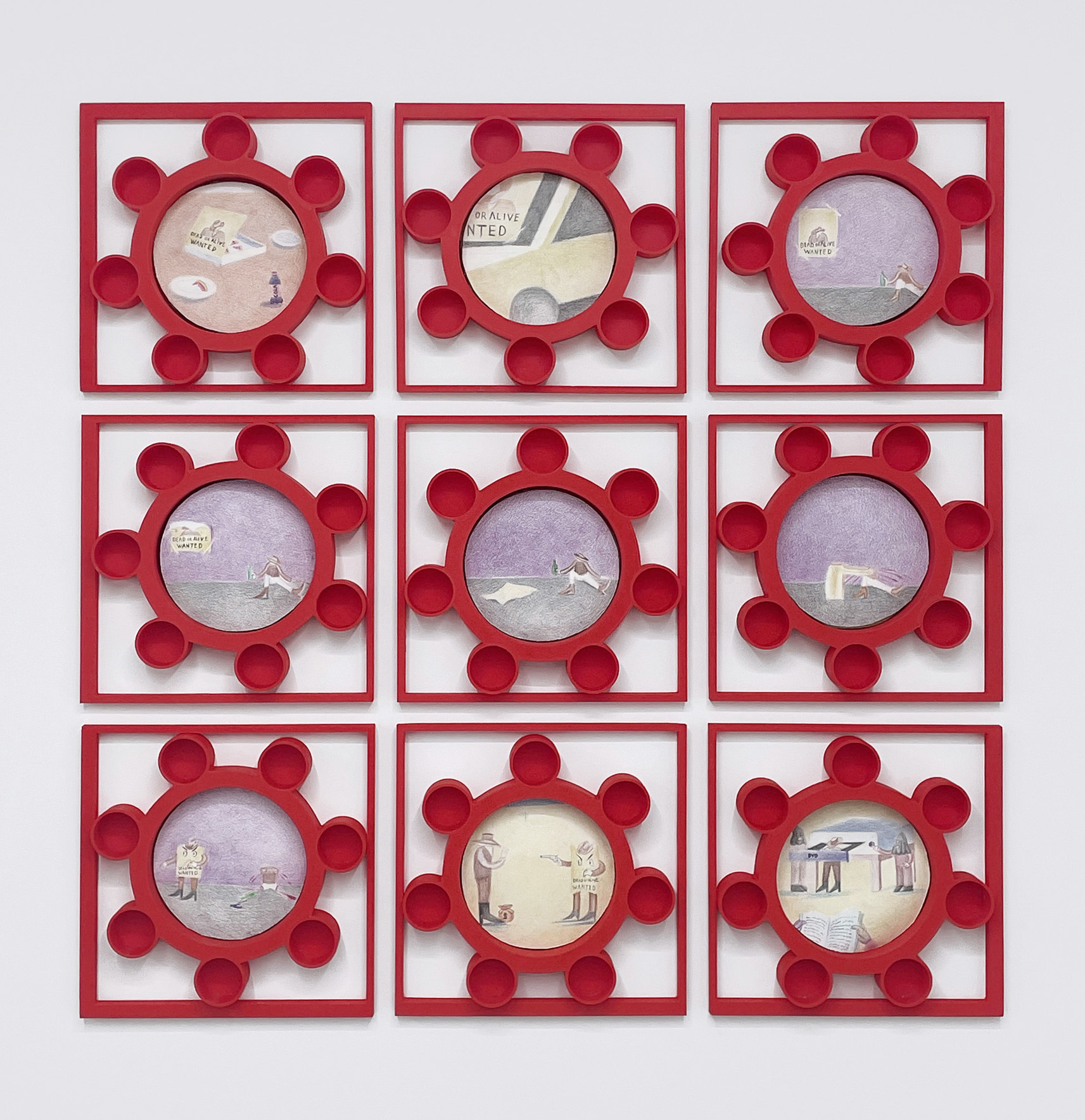 C’est justement cet héritage ambivalent que Lounis explore. A l’instar des personnages qui traversent son travail, le cowboy est un conteur, à la fois glorieux et pathétique. Il pourrait guider les troupeaux, mais préfère les récits et filer des métaphores qui mettent à rebours le fantasme d’une terre providentielle. La réalité est quelque part entre Lucky Luke et la précarité du travailleur du début de l’ère industrielle du 19ème siècle à l’ultra-libéralisme d’aujourd’hui. Quelque part entre un succès qui se raconte et un échec qui se tait (‘Love letter, Blanc’) et qui s’incarne en une seule entité. Le cowboy est une métaphore de l’humain en ce qu’il est fragile, à la fois truand aux bonnes intentions et victime d’un système (‘C’est étrange le grillon ne chante pas quand il y a un étranger’). Il est surveillé, recherché, exploité (‘La roulette russe’) mais il est aussi un poète qui sillonne les étendues, dépasse les frontières. Il est un alter ego de l’artiste. L’ambivalence du mythe est à l’œuvre ici (‘Let’s justice be done’) où la sentence ultime serait de se transformer en pitance pour lecteur DVD c’est-à-dire devenir une fiction, un divertissement : réécrire l’histoire.