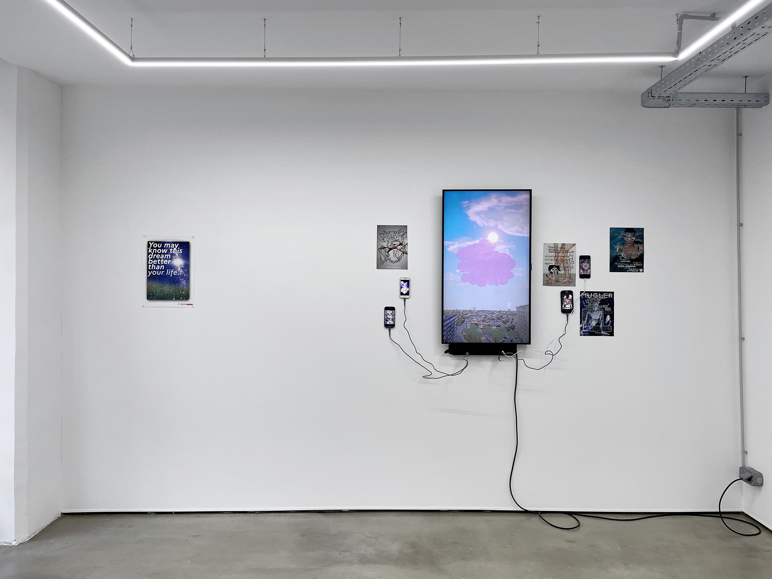 L’arrivée d’Internet s’accompagne ainsi de son lot de croyances et de mythologies alternatives. L’installation Dreams&Hopes de Montaine Jean évoquant la forme d’un autel rappelle que la technologie ne se départit pas de spiritualité. Internet devient un espace où l’on peut invoquer souhaits et prières. Inspirée de l’imaginaire de l’adolescence, l’installation présente une fenêtre de chambre ouverte sur un paysage appelant à la contemplation et à la rêverie. En fantasmant un ailleurs, l’esprit fait naître des désirs d’autonomie et d’individualité s’exprimant par des envies consommatrices. Les « gravoboi » (en référence au gourou d’une secte) font partie des « manifestations » qui sont ces petites formules magiques inscrites sous la forme de séries de chiffres. Elles expriment l’espoir de correspondre aux normes (le plus souvent de beauté) véhiculées dans les publicités des magazines (avoir de plus gros seins, perdre du poids, avoir des cuisses plus fines, etc.)