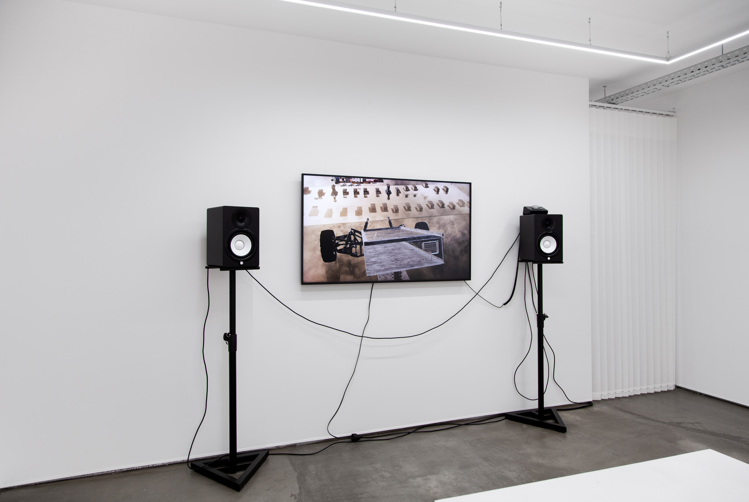 gallery, a central 3D animation video dialogues with a set of sculptures. A fountain traps various fragments in its transfixing water, while on